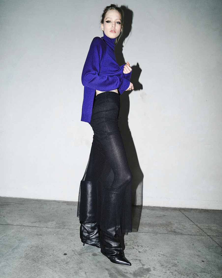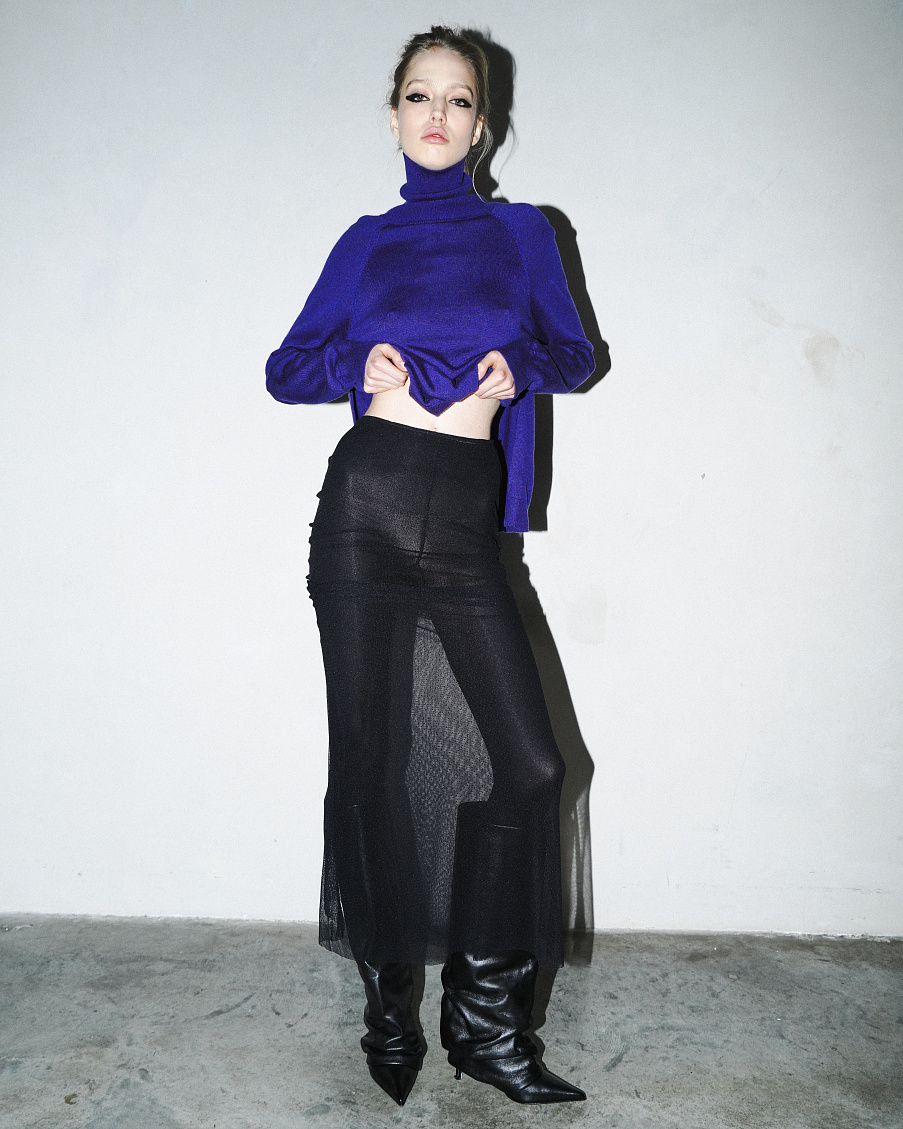 Вечерняя юбка с высокой линией талии, облегающего кроя, выполнена из эластичного полупрозрачного шифона с добавлением вискозы. Юбка красиво драпируется на бедрах