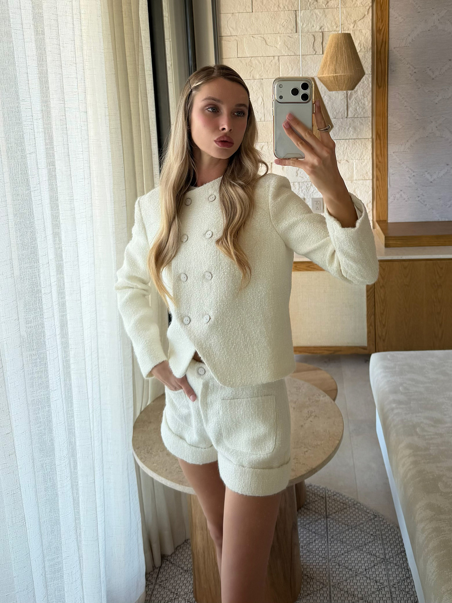 Шорты из премиальной тончайшей шерсти и вискозы. Декоративные карманы спереди. Рекомендуем сочетать с жакетом Seine.