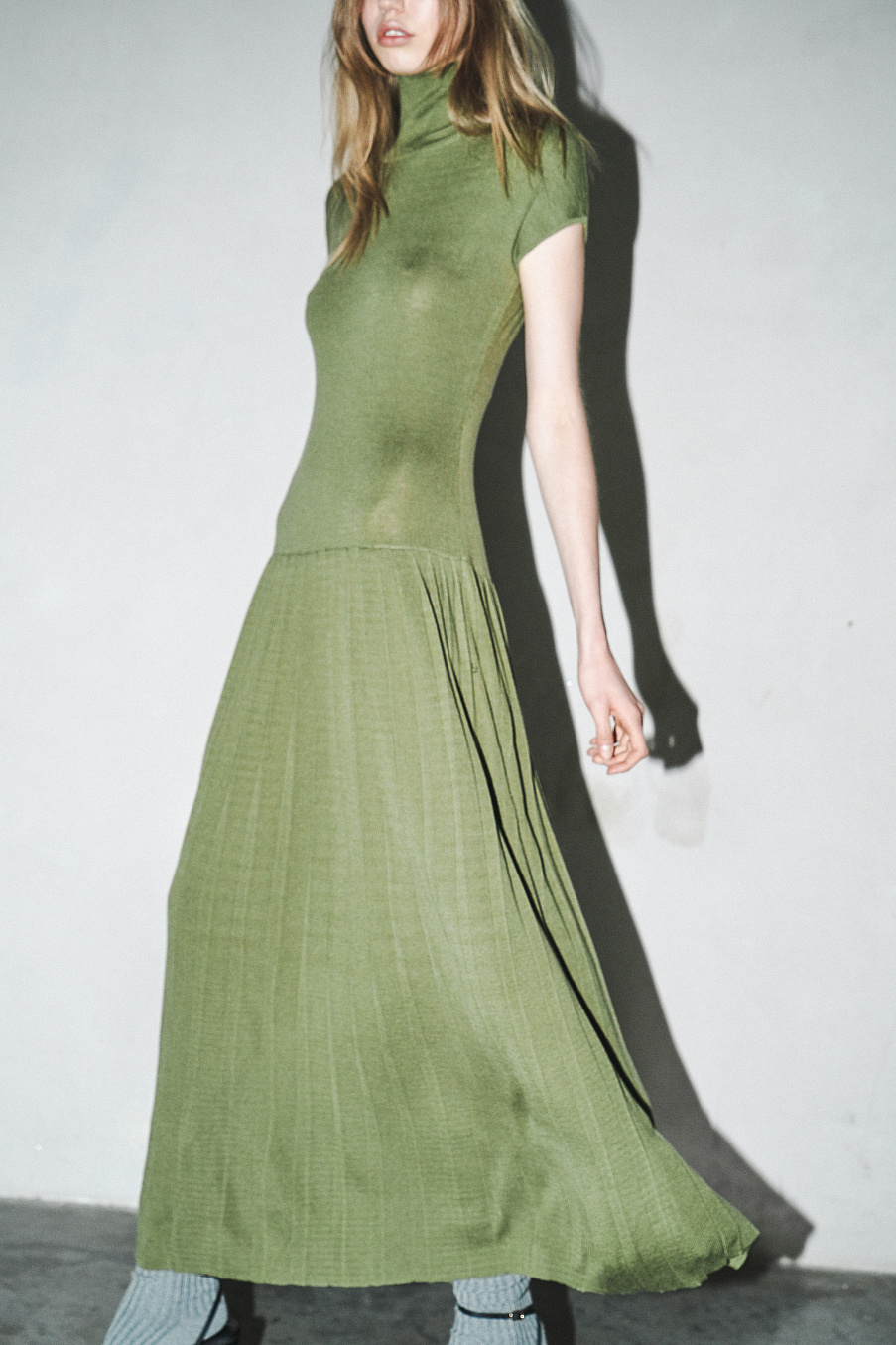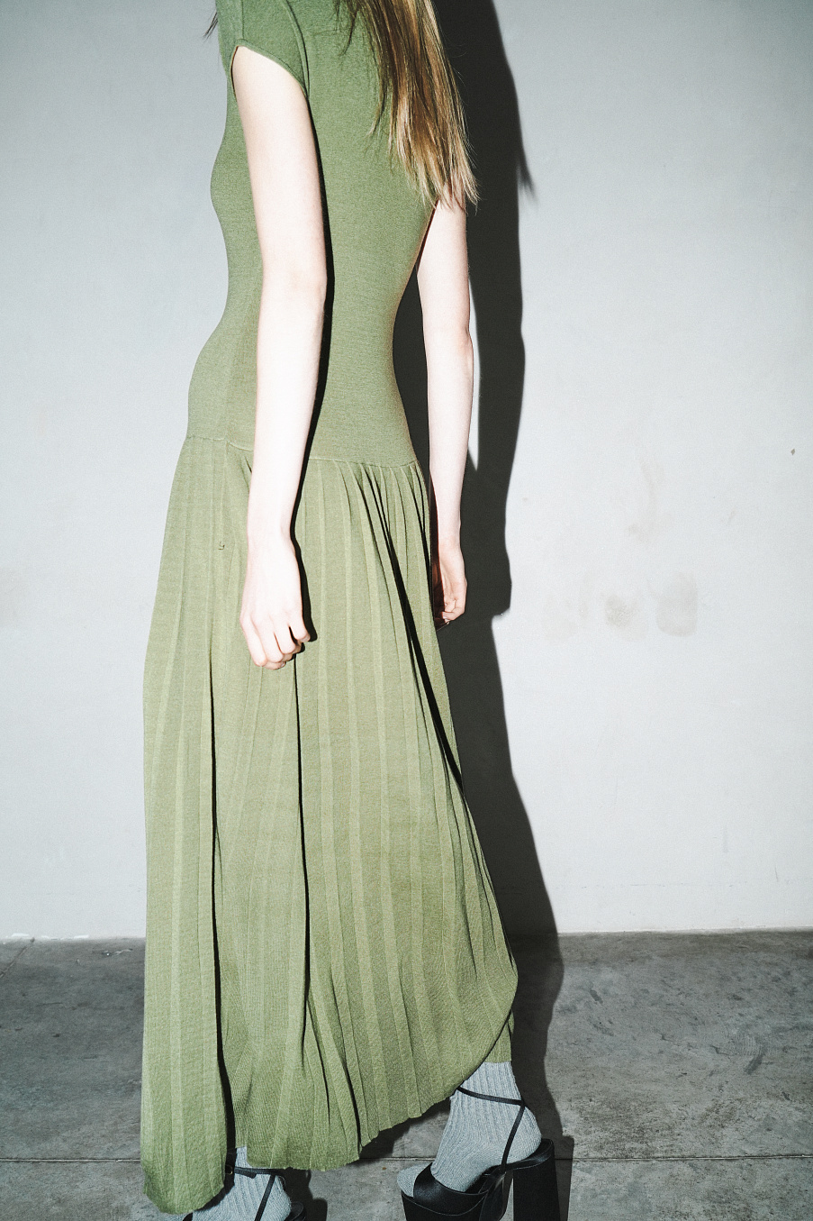 Платье с подчеркнутой талией и юбкой-плиссе в длине макси, изготовлено из итальянской шерсти и шелка. Длина макси, приталенный силуэт.
