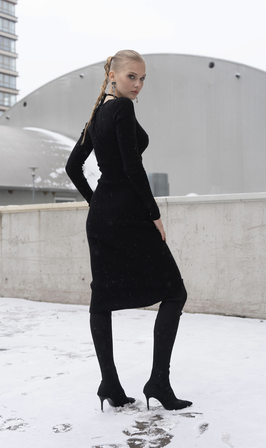 Трикотажное платье с разрезами и декоративными завязками вокруг шеи. Выполнено из итальянского кашемира и шерсти.
