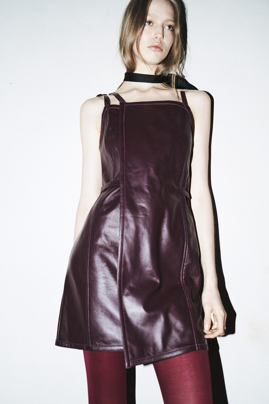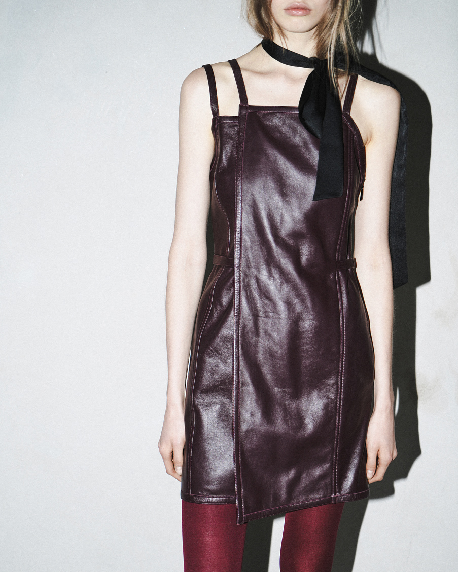 Платье SIN из кожи (100% ягенок) и облегающим фигуру силуэтом, подчернутым поясом и декоративными бретелями. Изготовленое из премиальной кожи, платье станет роскошной основой для зимнего образа в сочетании с кашемировым пальто или для вечернего выхода.