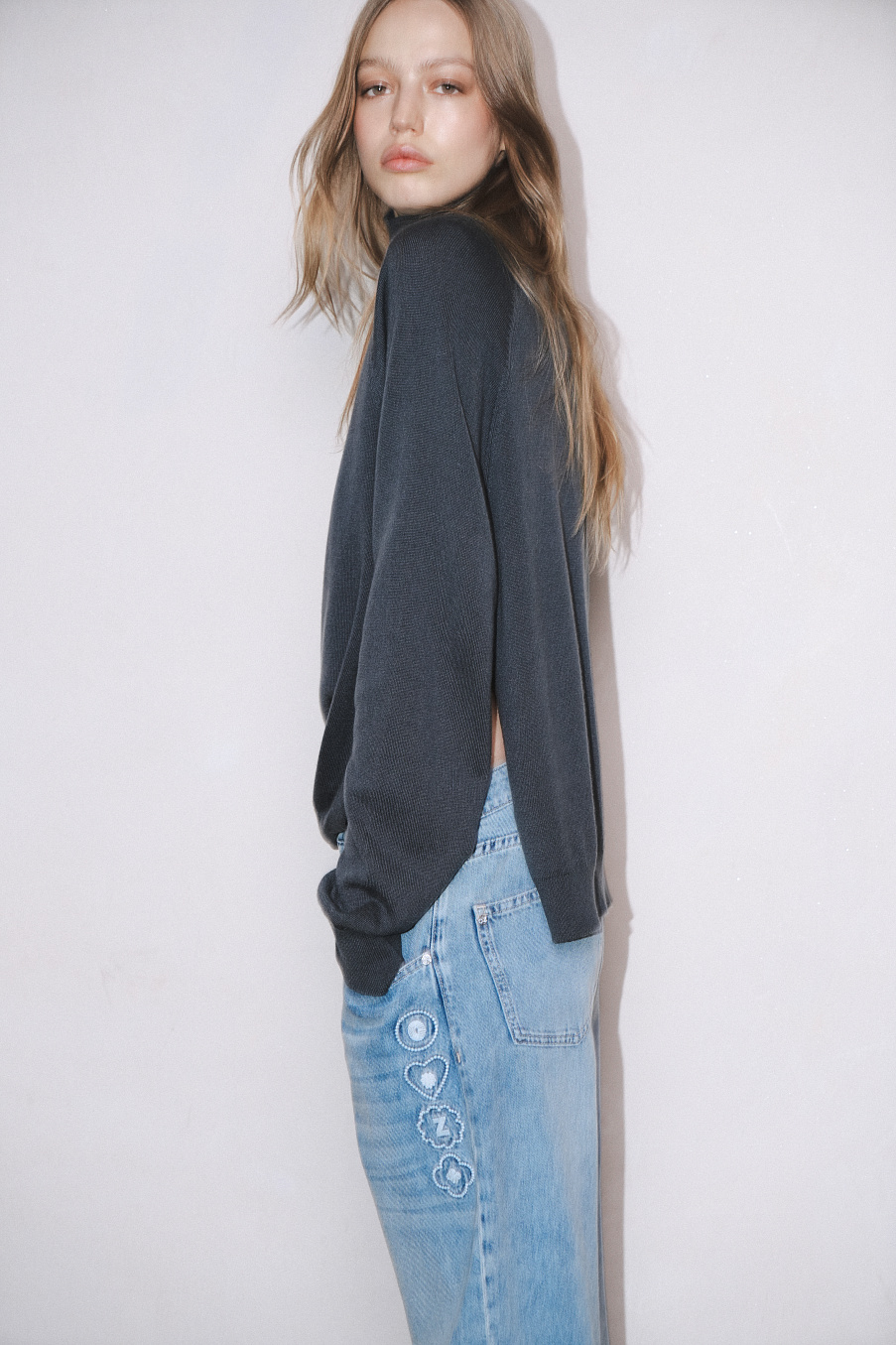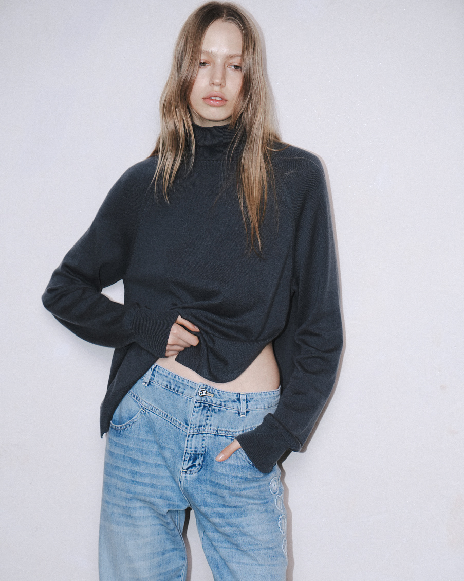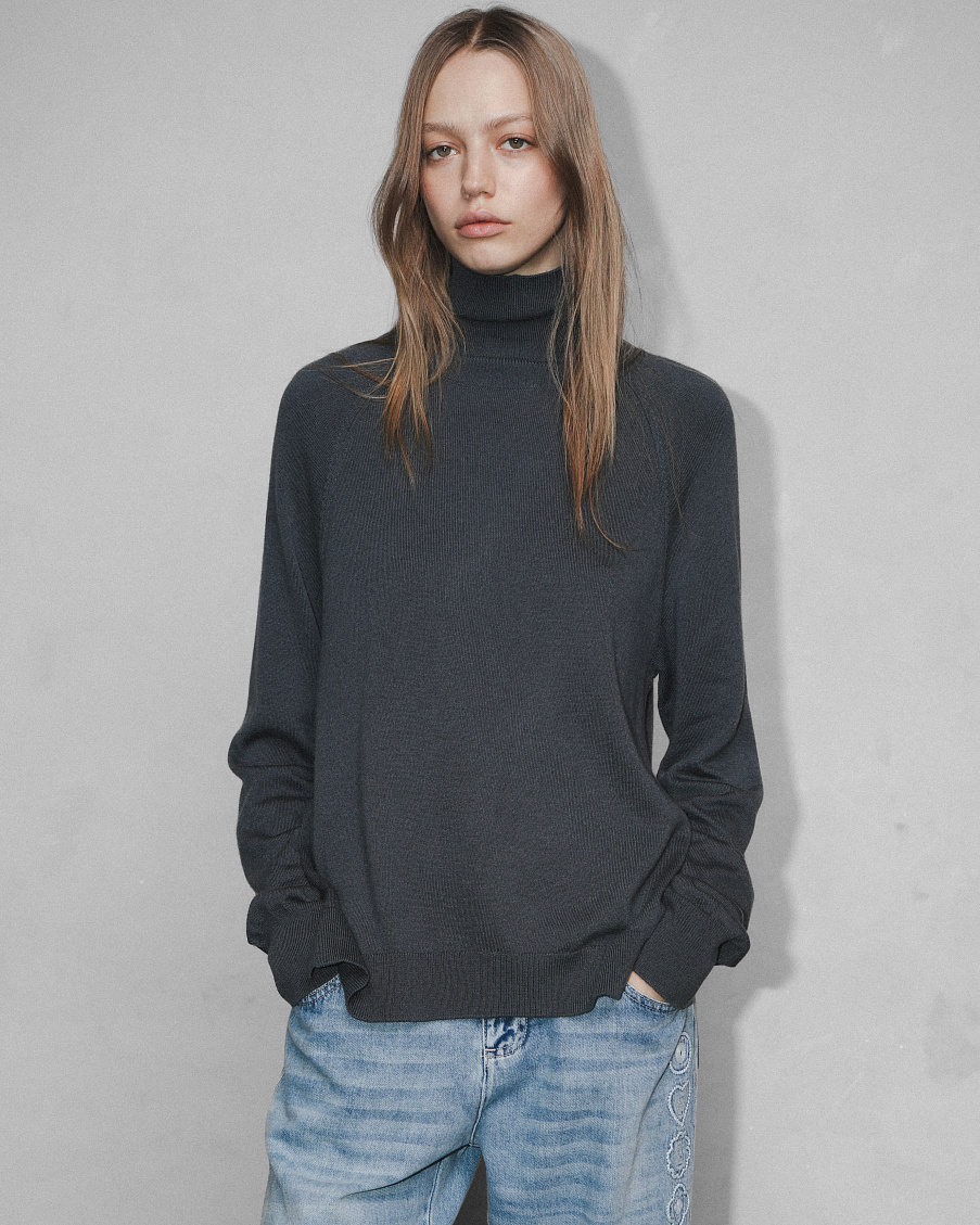 Трикотажный свитер из тонкой и мягкой премиальной итальянской шерсти с высоким горлом и разрезами, визуально удлиняющими силуэт. Свитер связан тонкой гладью, нежное переплетение делает его невероятно мягким и приятным для тела.