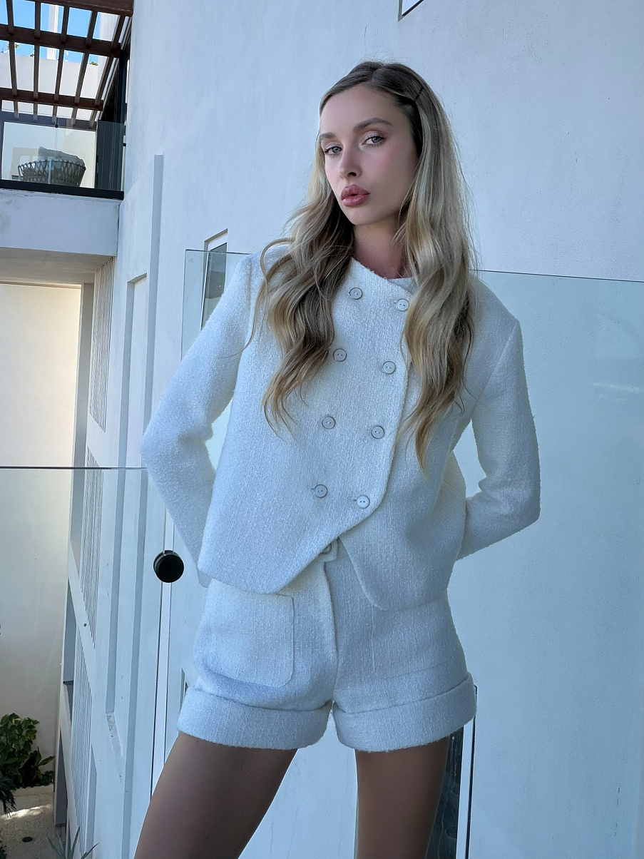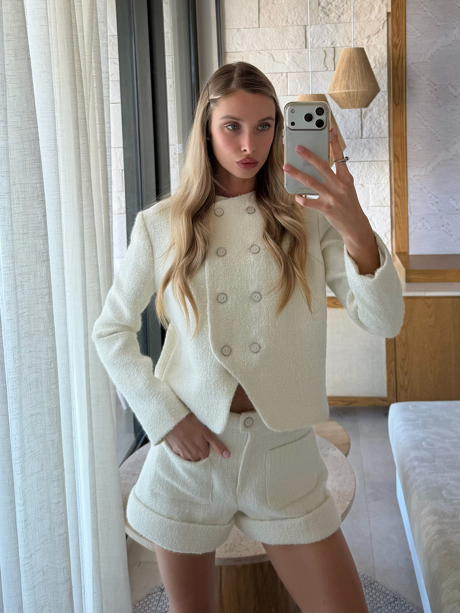 Двубортный жакет из премиальной тончайшей шерсти и вискозы с пуговицами в тон. Идеальная посадка, прямой крой делают его незаменимым и позволяет сочетать с любыми образами вашего гардероба.