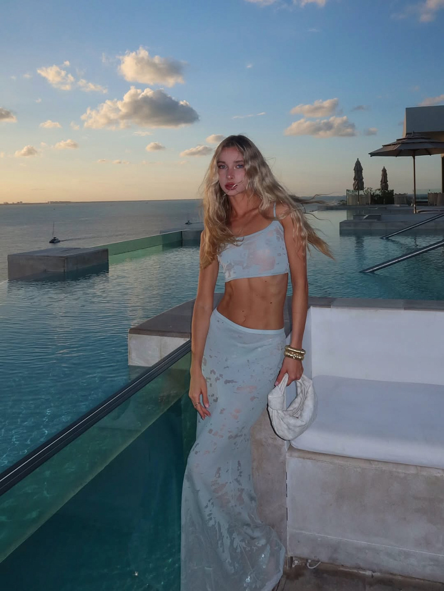 Костюм, состоящий из топа на тонких деликатных бретелях, и юбки в длине макси из струящейся вискозы, юбка создает облегающий силуэт и подчеркивает изгибы фигуры. Костюм из итальянской премиальной вискозы изготовлен с использованием новейшей технологии double layers, тончайшая вискозная нить поверх нейлоновой основы создает эффект деконструированных частиц.