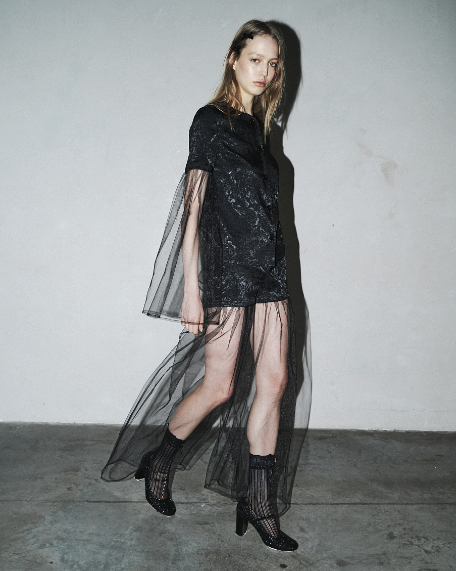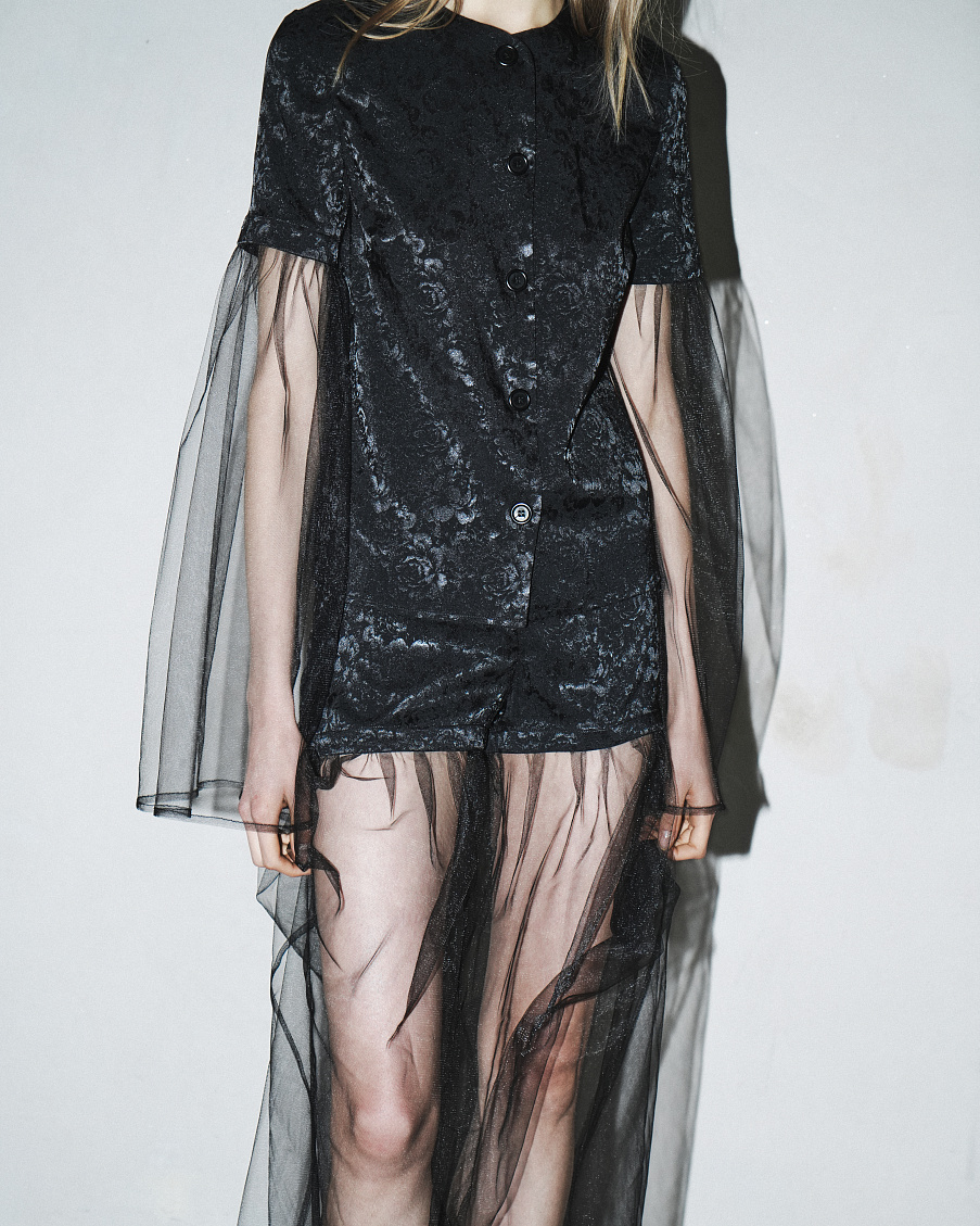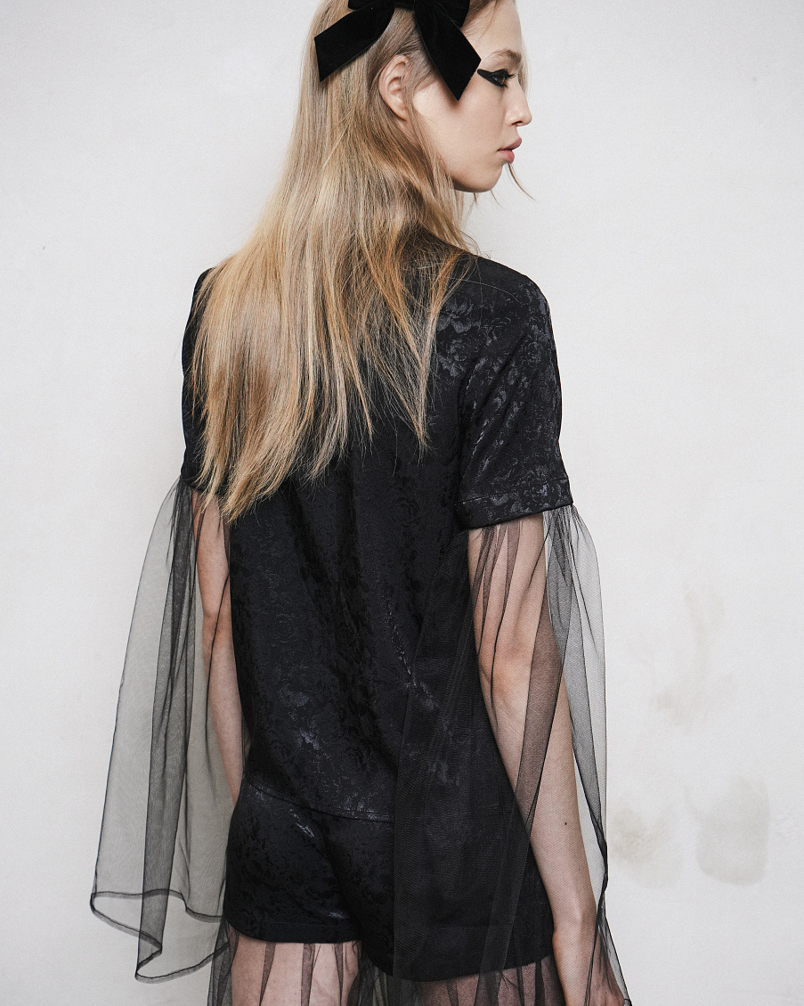 Эта вечерняя блузка из шёлкового крепа, играющая объёмами и многослойностью, создаёт сказочный образ благодаря полупрозрачным рукавам из органзы. Сочетайте её с нашими жаккардовыми брюками для создания изысканного вечернего образа.