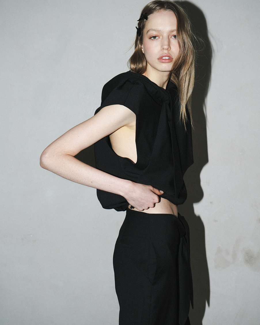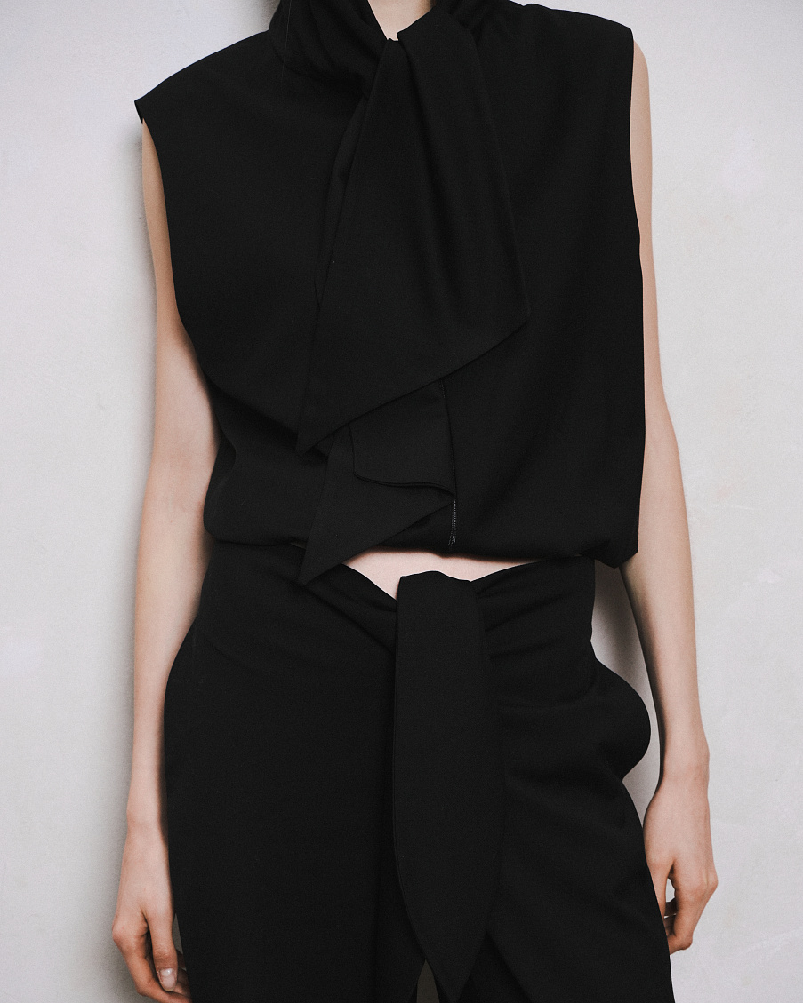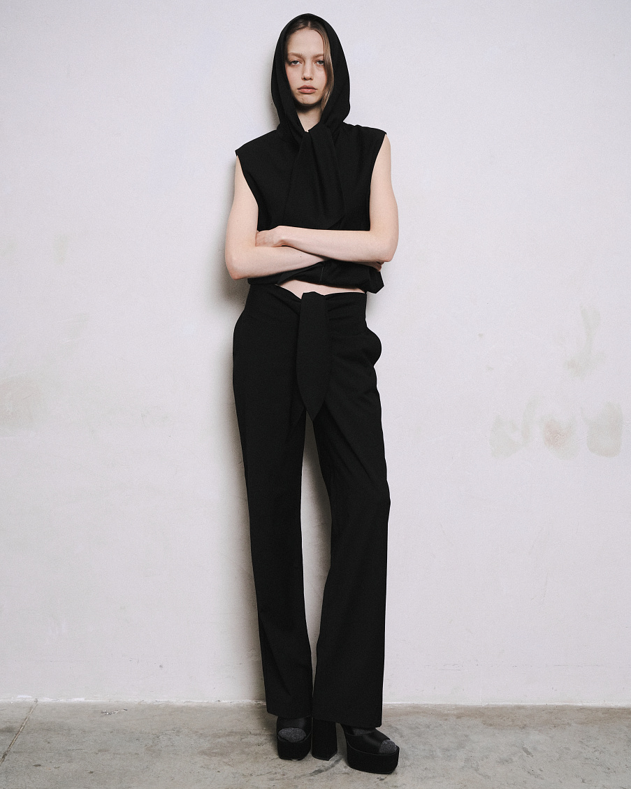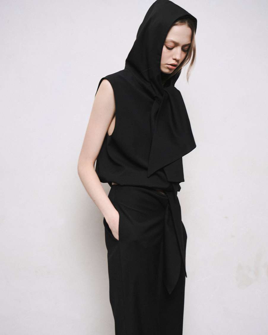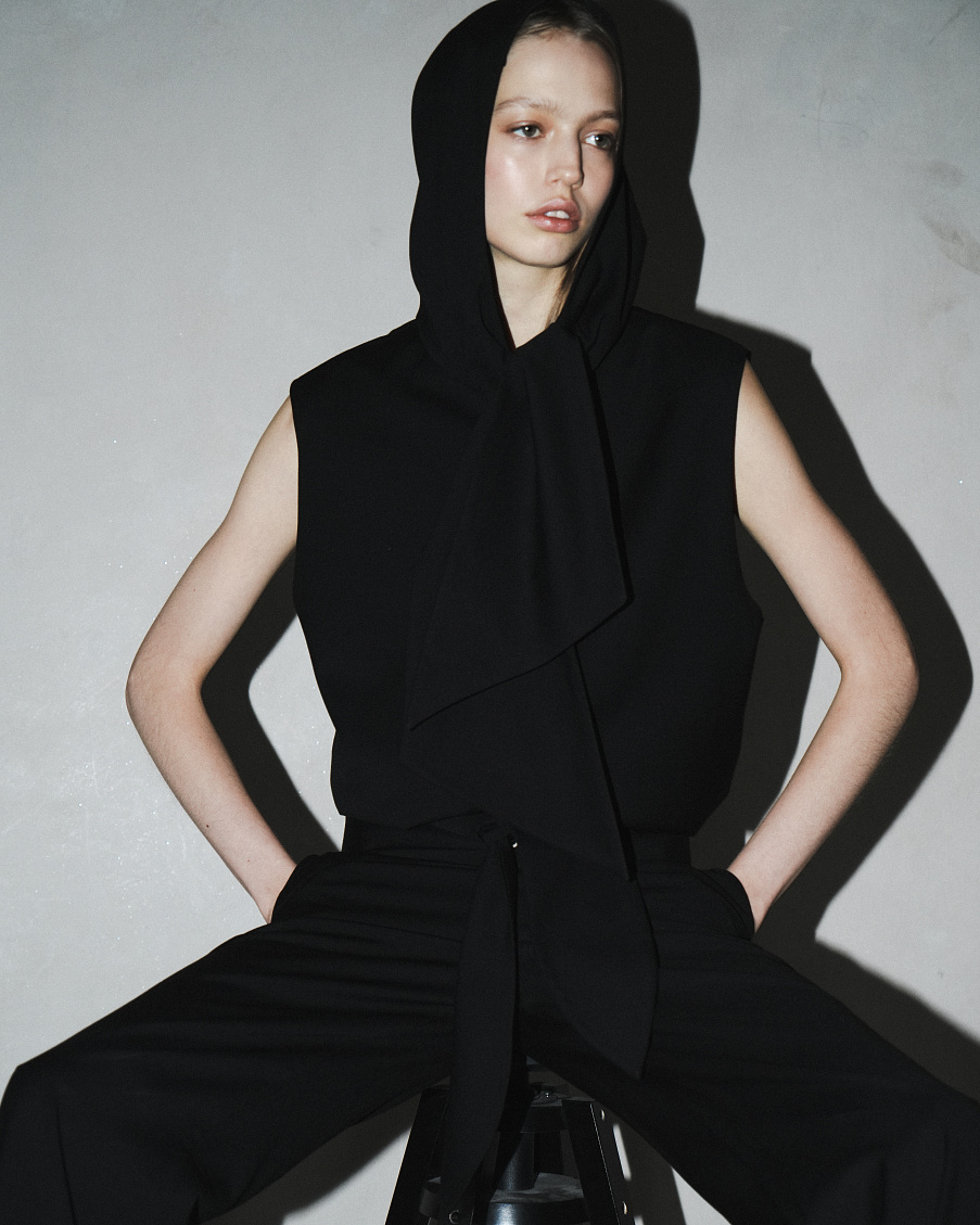 Жилет-бомбер с капюшоном, выполненный из итальянской вискозы. Глубокий капюшон завершается завязками-лентами, нижний край край с защипами и глубокая линия проймы создают шикарный и расслабленный образ