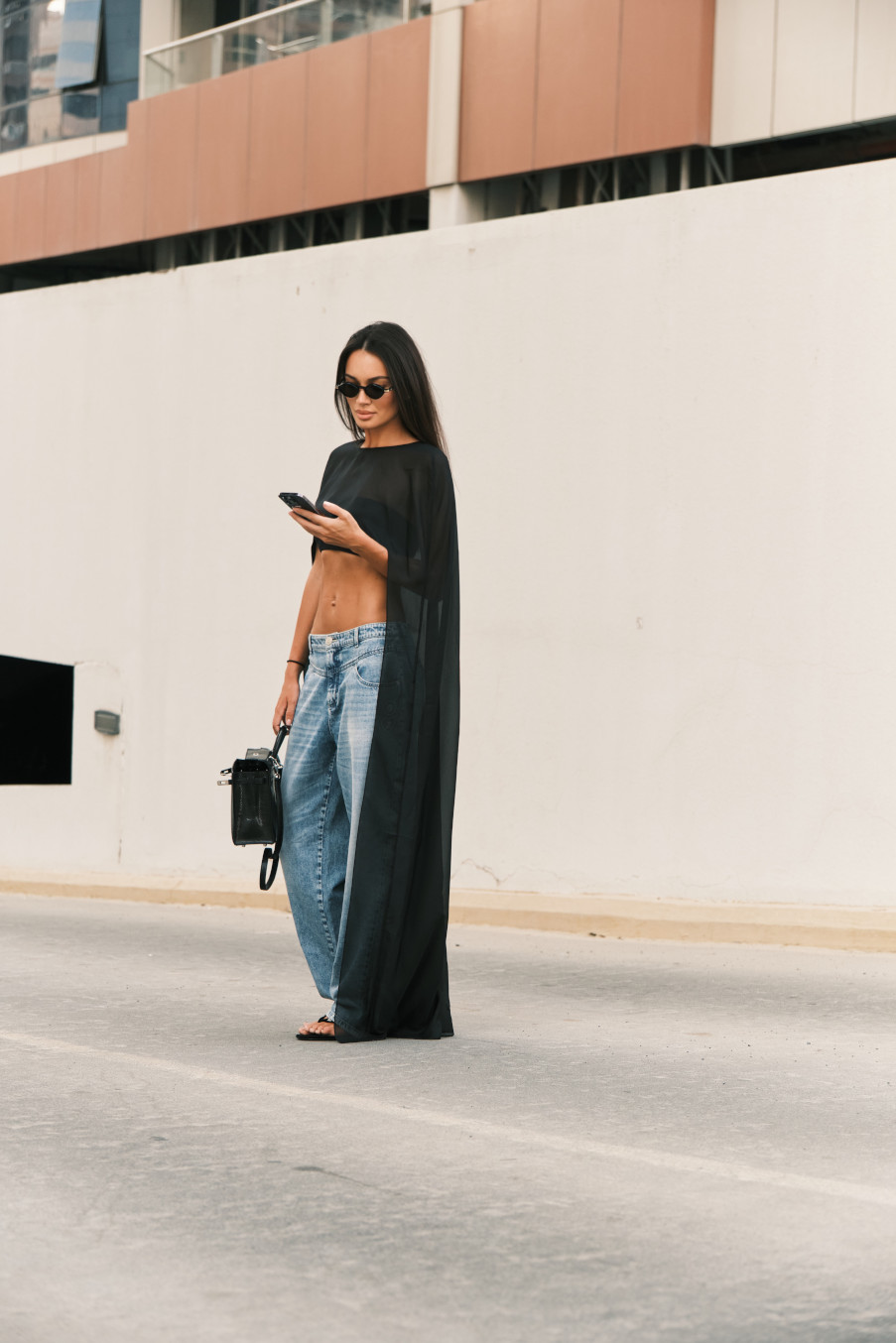 Полупрозрачная накидка выполнена из прозрачной органзы, образуя воздушный многослойный силуэт, привлекающий внимание. Застежка на пуговицу сзади, укороченный верх нежно окутывает плечи, удлиненный подол сзади.