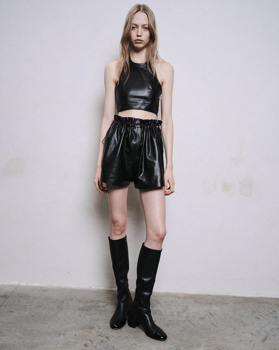 Топ из кожи ягненка, облегающий крой, застежка на молнию. Застежка на шее позволяет регулировать длину бретелей.
